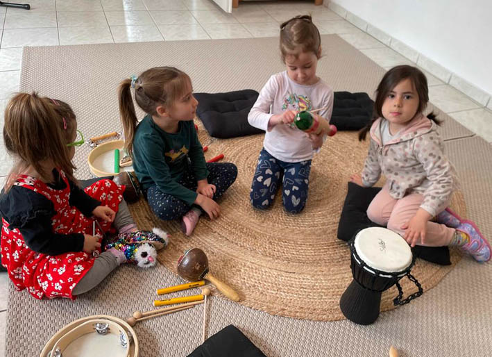 L'éveil musical est pratiqué en groupe, ce qui encourage les enfants à interagir avec les autres, à écouter, à attendre leur tour, à collaborer et à respecter l'espace sonore commun.